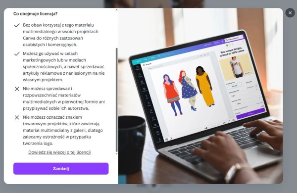- Canva przydziela licencję każdemu wykorzystanemu elementowi z biblioteki. Autorzy poszczególnych elementów mogą ograniczać zakres użytku komercyjnego, dlatego odpowiedzialne używanie Canvy wymaga każdorazowej weryfikacji licencji.