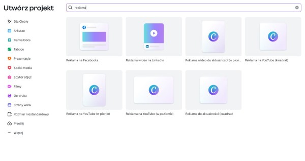 Canva umożliwia utworzenie projektu graficznego o wymiarach dopasowanych do poszczególnych mediów społecznościowych. Źródło: Canva